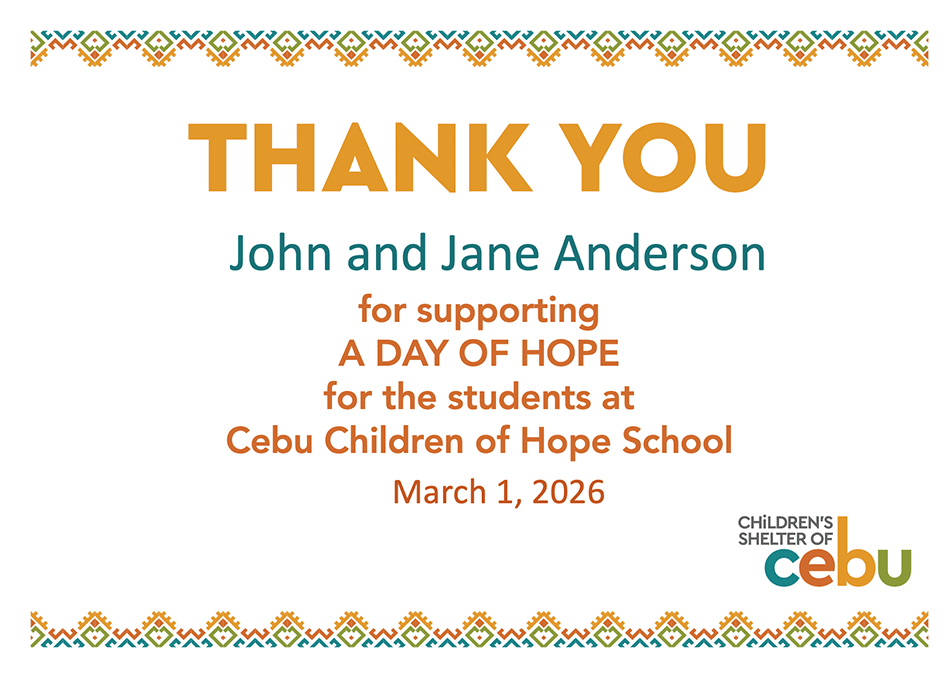 Join our mission by supporting a DAY OF HOPE School Sponsorship Program. Your gift of $475 goes toward covering expenses for operating Cebu Children of Hope School for one day.